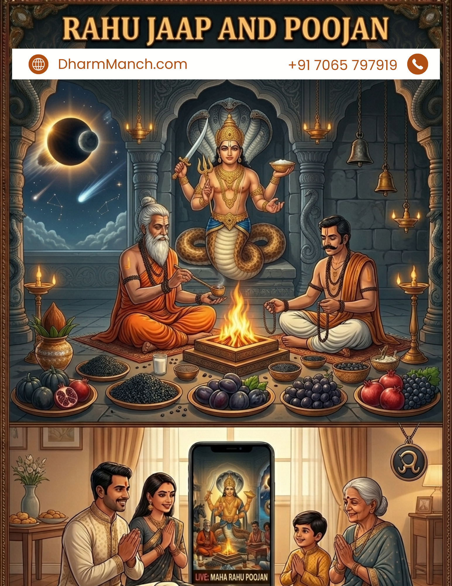 Book Rahu Graha Shanti Jaap Online with Dharm Manch to overcome Rahu Dosha, confusion, mental stress, illusions, and unexpected obstacles. This powerful Vedic remedy balances Rahu’s shadow energy and restores clarity, protection, and stability in life.
